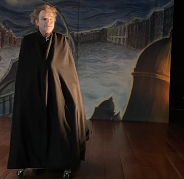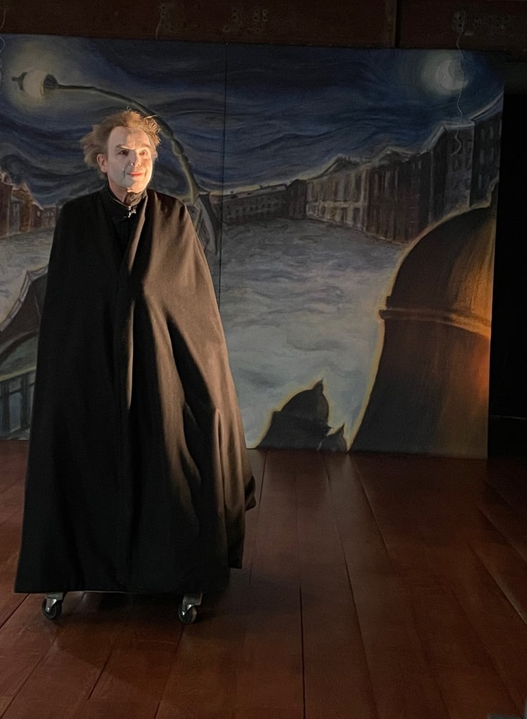 Très vite, le choix s’est imposé du seul en scène où une narration à multiples visages se déploie constamment. Aussi s’agit-il d’interpréter un « narrateur étrange », mi-marionnettiste détaché, mi-Monsieur Loyal empathique, pour se métamorphoser au fil du récit en Akaki Akakiévitch, le tailleur Porphyre, le « personnage important », ou esquisser le commissaire, des fonctionnaires de tout rang et d’autres figures périphériques.